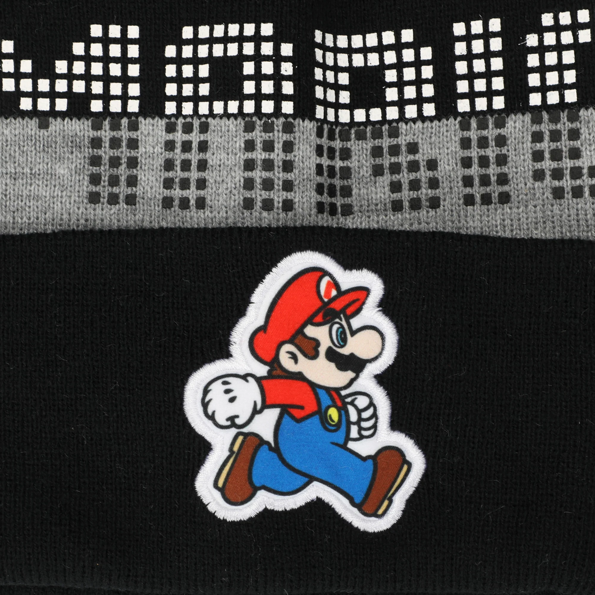 - CUSTOM DESIGN: Mario runs along the cuff on this beanie while his name appears above him in black and white squares. Fans of the Super Mario Bros video game series will love the fun custom design on this beanie.